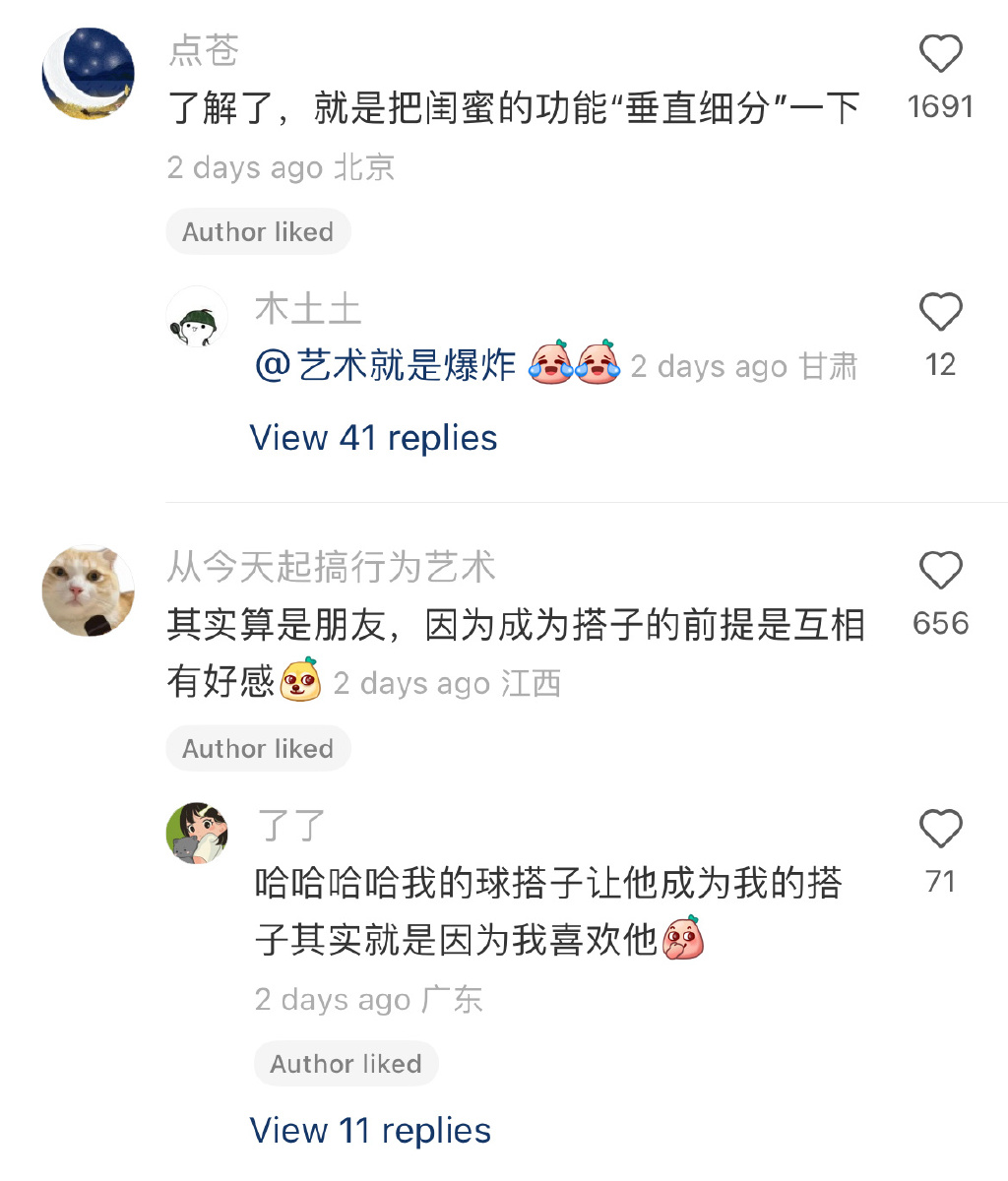 “哈哈,前不久一个小伙伴告诉我她的分类里也有这么一类搭子,高于同事和一般朋友,但低于闺蜜。”