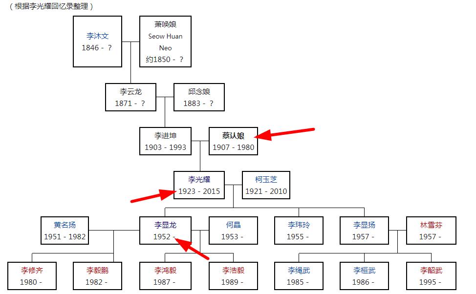 所以,我们看李显龙的家族,从爷爷这一脉的祖籍来看是广东潮汕的;从奶奶蔡认娘这一脉来看,他是福建漳州海澄的。据悉,蔡认娘生于1907年,父亲是新加坡当地的富商蔡金鼎(Chua Kim Teng),母亲是印尼客家后裔Leong Ah Soon。她的父亲虽然在新加坡出生,但她的祖父其实是来自马六甲的闽南民系,祖籍福建漳州海澄。