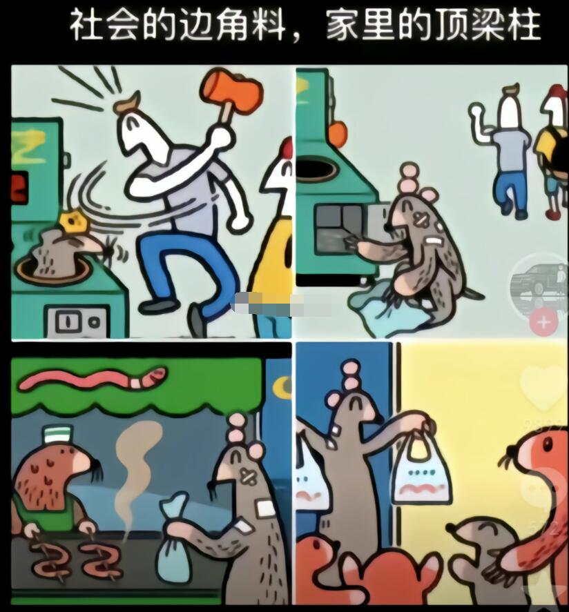 以“社会的边角料”为主题,网友创作了很多感人的漫画,比如: 社会的边角料·妈妈的小骄傲,意思是无论孩子是怎样的,都是父母心中的宝贝。 ![]() 社会的边角料·家里的顶梁柱;这个意思是虽然在社会上是一个最不起眼的人,甚至是低三下四的人,但是在家里面,他却是最重要的那个人。 ![]() |
