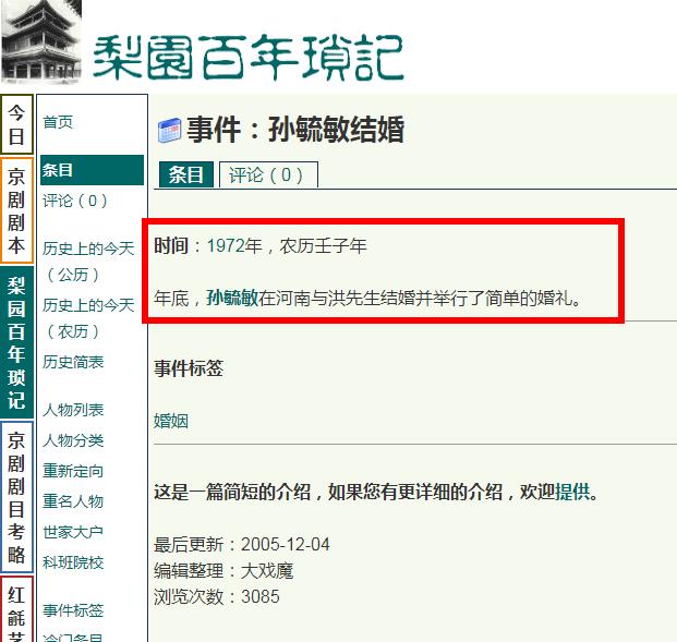 网上关于孙毓敏家庭情况的介绍很少,比如是否已婚,丈夫是谁。在一个名叫“梨园百年琐记”的网站上有一条信息是,孙毓敏已经在1972年那个动荡的年代结婚,当时她正被下放到河南,在河南跟洪先生结婚。 ![]() 此外,还有说孙毓敏的丈夫是金喜全的,这个说法应该是错误的,因为 金喜全的妻子叫熊明霞。 ![]() |