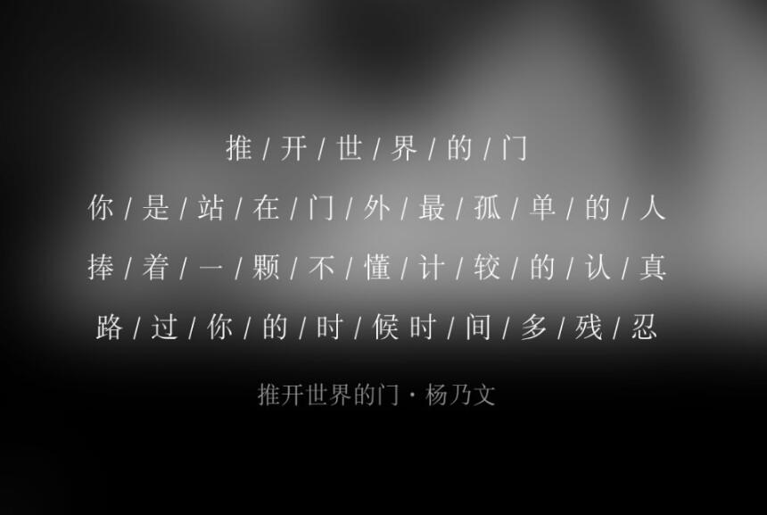 时间是一把镜子,它不仅致青春,他更要照见当下的自己。所以再推开世界的门,你是站在门外最孤单的人,和世界拼搏过一阵,茕茕孑立,一个孤单的背影,就个中心酸,又有谁能够知道?只能感慨路过你的时候,时间多残忍。