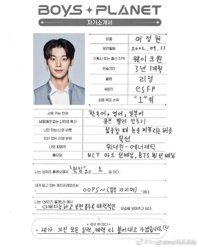 李政县(이정현),罗马拼音名LEE JEONG HYEON,2002年9月11日出生于韩国,他身高183CM,所属公司是WAKEONE。在2023年3月29日最新的boysplanet新闻发布会上,李政县说:“我们将在第三次任务中展示我们令人耳目一新而性感的一面,并尝试不同的声乐风格。我在现实生活中非常无忧无虑,但我必须在舞台上变得可爱和性感!”下面是他更多的相关资料: