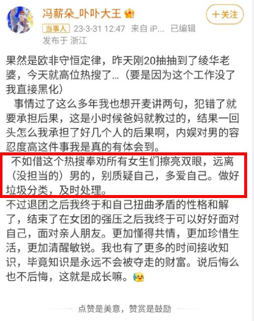![]() 2019年12月,一段私生饭偷偷在陆思恒家门口安装监控的偷怕视频曝光,这直接实锤了陆思恒和冯薪朵同居的传闻,随后冯薪朵痛快的退圈,退出SNH48,然而三年后,再看到冯薪朵的消息,没想到是两个人分手。 ![]() 当年虽然私生不对,但确实爆料出这两位已经同居的事实。两人在第二届超新星相识,冯薪朵所在的北部战队水晶被爆了之后,胜方南部战队的陆思恒冲到冯薪朵面前来了一段金蛇狂舞,太像小学男生欺负喜欢的女生了。 ![]() |
