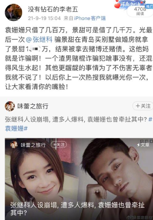网传,张继科沉迷赌博,输了大量钱财,然后为了还债,将景甜的私密视频抵给了债主。在李微敖爆料之前,其实就已经有人在网上爆料张继科的事,只是一直被压下来了。 一个叫@没有钻石的李老五在2021年9月19日表示张继科不仅骗了景甜的钱,还骗了袁珊珊的前。 ![]() 假如以上爆料属实,那么张继科彻底人设崩塌。目前张继科方面已经发声明辟谣上述事件,但是我们看这次爆料人李微敖没有将爆料的博文删除,很多人好奇 这位神通广大的李微敖到底是谁? 据悉,李微敖是著名记者,他1981年2月19日(农历)出生,毕业于香港城市大学,2003年开始新闻从业,经济观察报首席记者,湖南财政经济学院客座教授。 ![]()