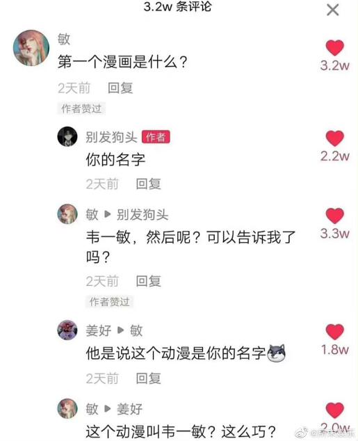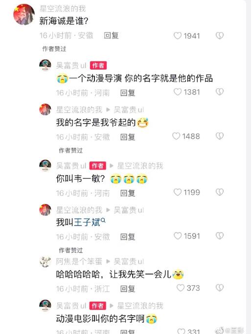 出自网友@星空流浪的我 他问“新海诚是谁?”作者告诉他“是一个导演,你的名字就是他的作品”。星空说“的名字是我爷起的”。作者问他“你叫韦一敏?”星空回道“我叫王子斌”。