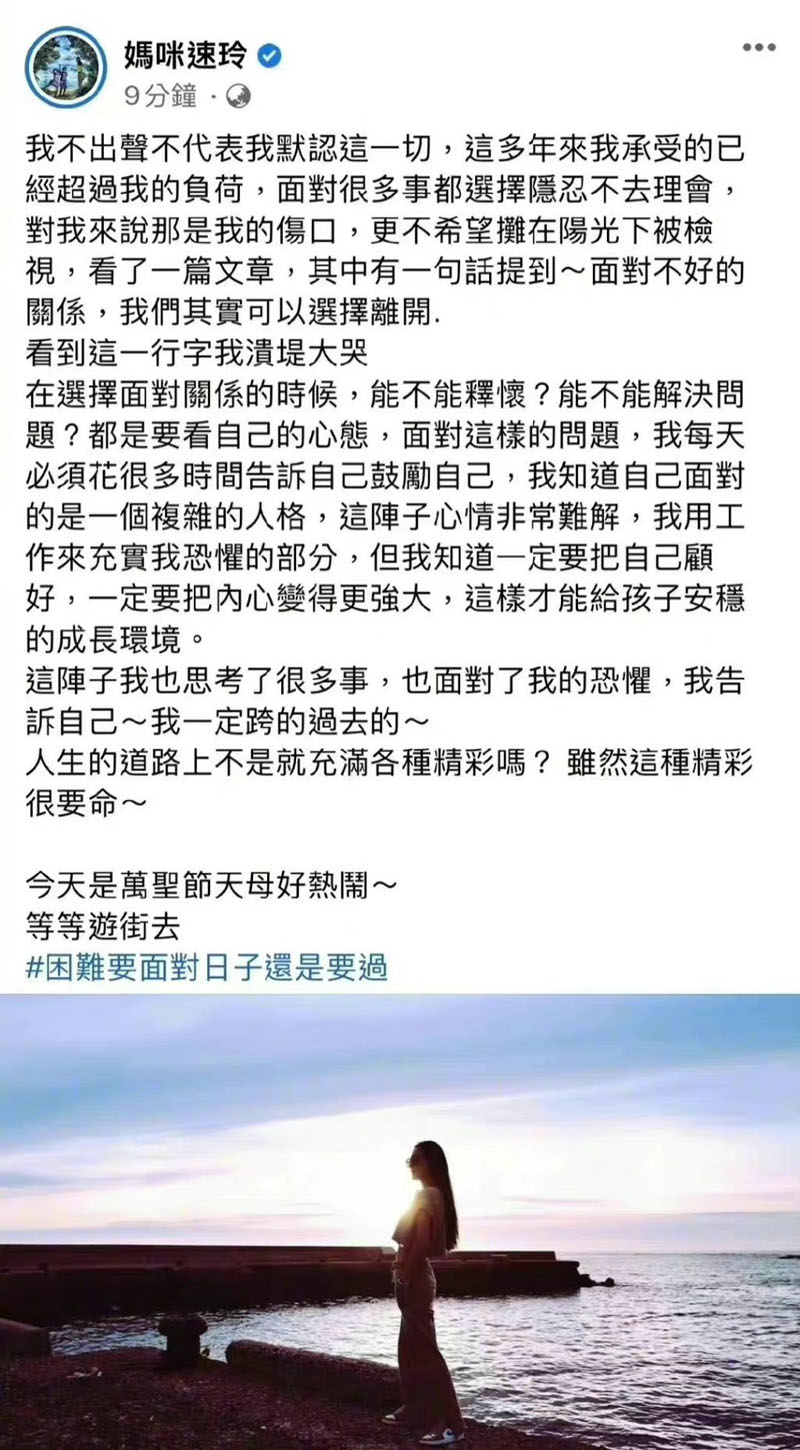 在选择面对关系的时候,能不能释怀?能不能解决问题?都是要看自己的心态,面对这样的问题,我每天必须花很多时间告诉自己鼓励自己,我知道自己面对的是一个复杂的人格,这阵子心情非常难解,我用工作来充实我恐惧的部分,但我知道一定要把自己顾好,一定要把内心变得更强大,这样才能给孩子安稳的成长环境。