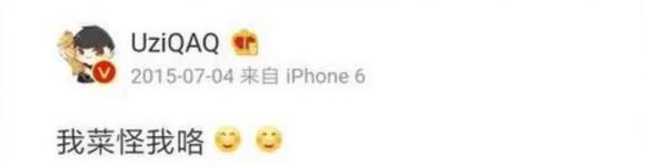 在夏季赛OMG 0 : 2 输给了联赛垫底处于保级区的UP战队后,Uzi直接发微博写道“我菜怪我咯”。
