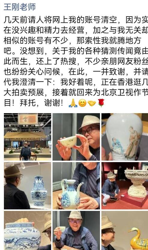 没想到,关于我的各种猜测传闻竟由此而生,还上了热搜,不少亲朋网友粉丝也纷纷关心问候,在此,一并致谢,并请代我澄清一下:我好着呢,正在香港逛几大拍卖预展,接着就回来为北京卫视作节目!拜托,谢谢!”