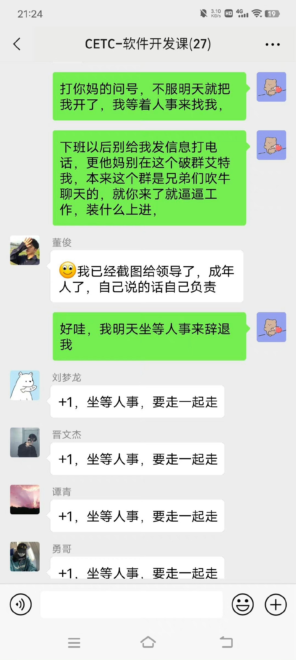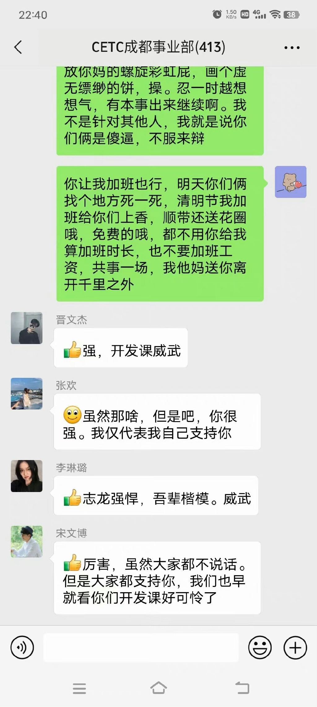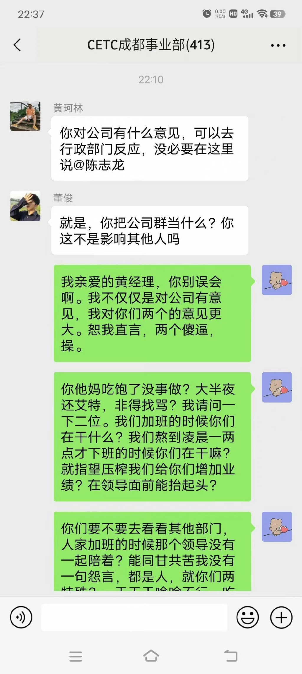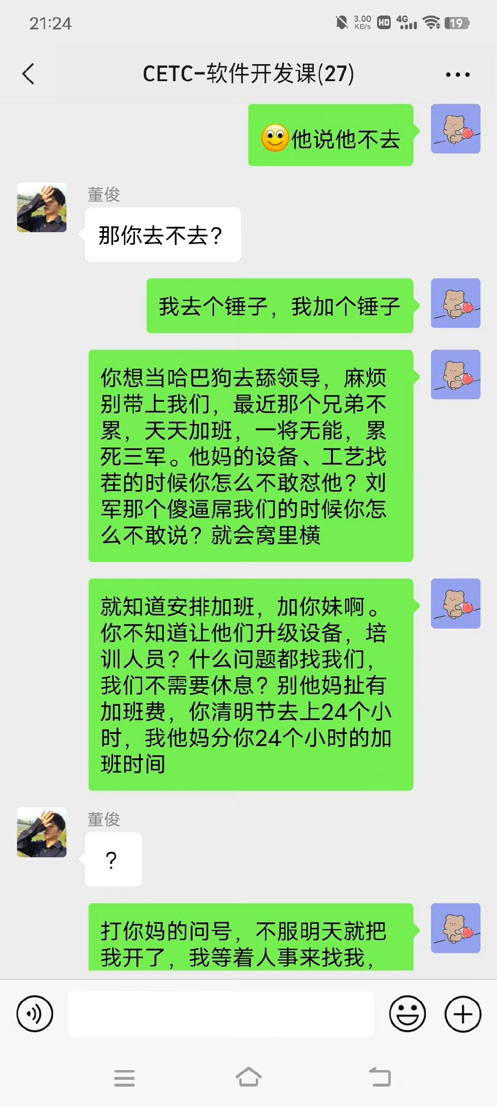 “中国电科CETC加班事件”指的是在清明节的前一天,中国电科的“CETC软件开发课”的领导董俊在群内安排加班,指定陈志龙加班,结果因为他们项目组长期加班,导致情绪不佳,把董俊给骂了个狗血淋头。如果你看了整个聊天记录,就会明白这位最火打工人的核心诉求并不是抱怨加班,而是直属领导的尸位素餐。这是国企,居然能把一个部门的人干到集体辞职,也是绝了。 陈志龙为什么这么暴躁?看他的核心诉求:
