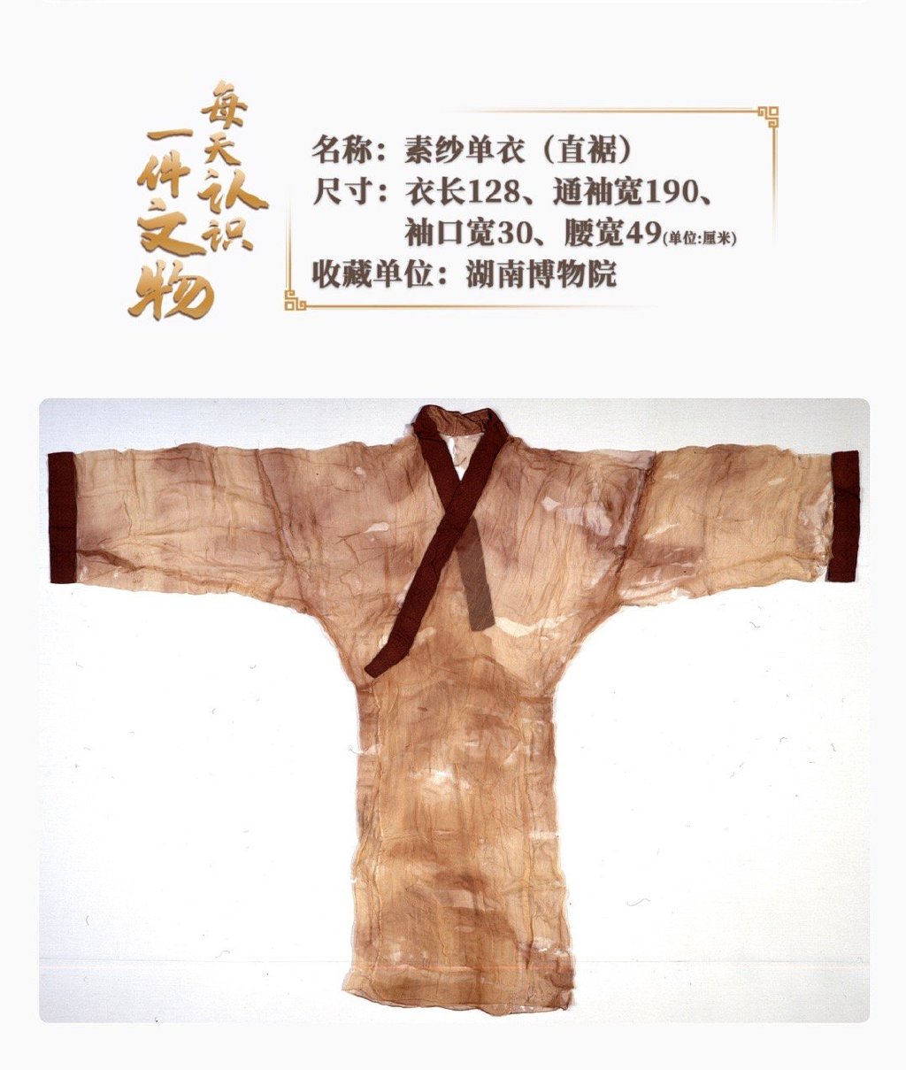目前这件素纱单衣在湖南省博物馆展览,辛追墓出土。右衽(rèn,衣襟)、直裾(jū,前襟)。重49克。汉代文献描述其薄如蝉翼、轻若云雾。多数学者认为它应穿在绵袍之外,既可增其华丽,又具朦胧美感;也有学者认为是内衣。这是迄今所见最早、最薄、最轻的服装珍品,是西汉时期纺织巅峰之作,代表了汉初养蚕、丝、织造工艺的最高水平。