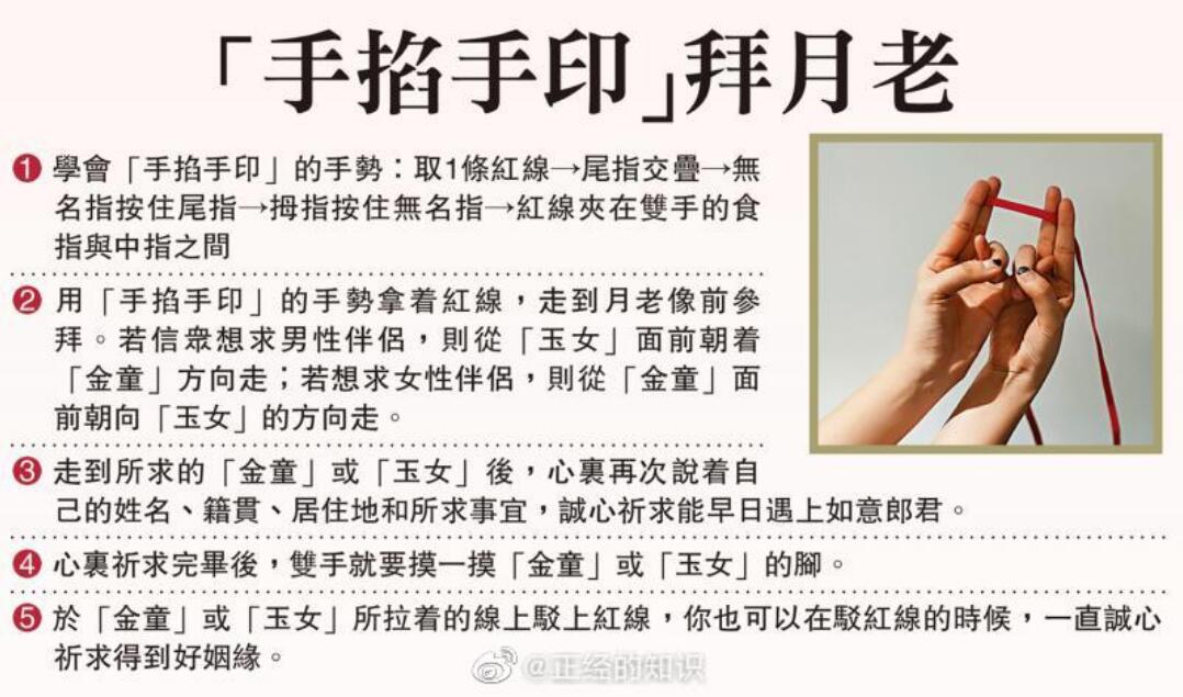 月老手势单身的朋友一定要学,当你想去参拜月老的时候,并不是双手合十就够成心,需要使用专门的参拜月老手势,先把拇指及无名指粘上,再把尾指交叉穿通,由拇指及无名指粘成圆圈,然后把这个圆圈扣紧,最后以食指及中指夹紧小红绳。