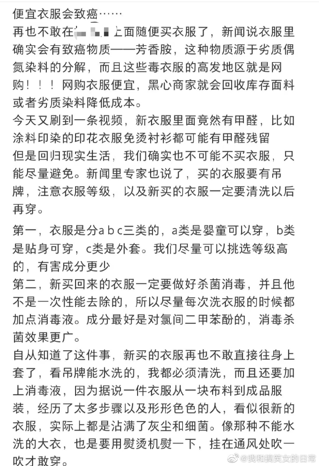 你知道吗??穿劣质衣服可能会致癌,一种名为“联苯胺”的可致癌芳香胺因为价格便宜,常常用于一些价格便宜的衣服上作为染料使用。联苯胺(4,4-二氨基联苯)是一种有机化合物,2017,世界卫生组织国际癌症研究机构公布的致癌物清单初步整理参考,联苯胺在1类致癌物清单中。它曾是染料合成的重要中间体,从它可以合成超过300种染料,但由于毒性很强,现已改用其他毒性较小的原料。联苯胺及其盐都是有毒且会致癌的物质,固体及蒸汽都很容易通过皮肤进入体内,引起接触性皮炎,刺激黏膜,损害肝和肾脏,且会造成膀胱癌和胰腺癌。