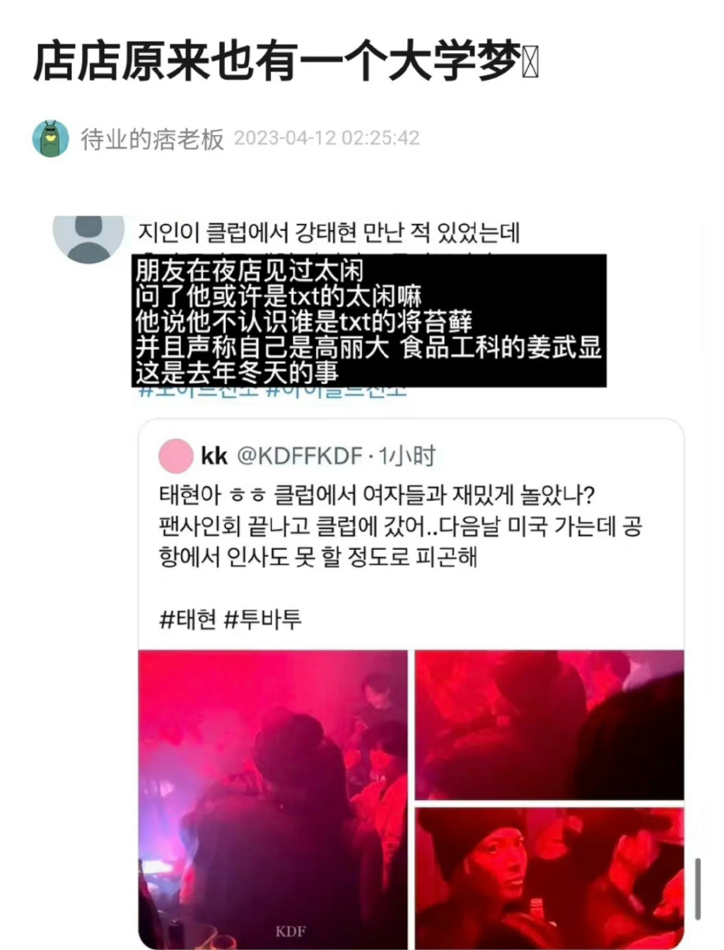 近日,有网友拍摄到点点在夜店里面搂着美女的画面,有意思的是点点发现了镜头好像还和镜头对视了,对视了之后还若无其事的继续搂着女生,爱豆的直觉和侥幸碰撞后,他毫不犹豫的选择了侥幸,这心理素质太强了。 ![]() 下面是韩国网友在社区上的爆料 ![]() |