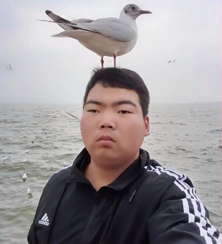 “海鸥会为我停留,而你呢?”意思是你愿意陪在我身边吗?出自一位叫@绝地求生 的网友,上个月他来到了云南昆明的滇池,还正好拍摄到了一张红嘴鸥站在头上的照片,照片里的他的眼神仿佛写满了故事