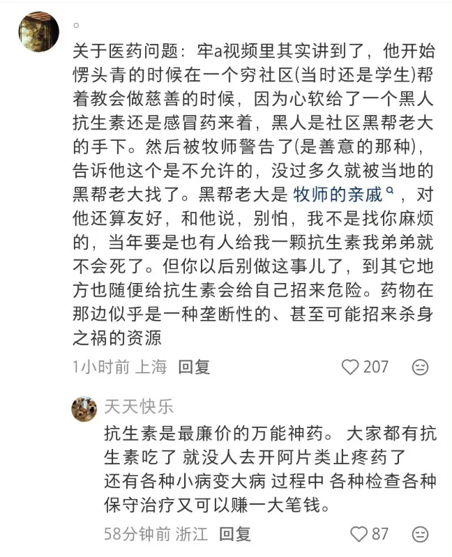 这里面还有一个真实的故事:有一位中国留学生网友亲切的称之为“牢A”,当年在美国总做义工的时候,因为给了一个可怜的黑人一点抗生素,被黑帮老大和教会牧师警告...