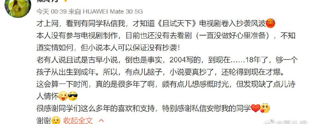最近《且试天下》正在热播,随着收视率提高,有网友对比电视剧《且试天下》和《鹤唳华亭》,两部影视剧皆有一段科考舞弊案的剧情,网友在分镜、台词重合度、出场角色设定上进行了对比,疑似《且试天下》编剧抄袭《鹤唳华亭》权谋部分,由此引发热议。很快不少网友将抄袭的源头追溯到原作者倾泠月头上。不过对于质疑,作者倾泠月发微博称:“本人没有参与电视剧制作,目前也还没有去看剧(一直没做好心里准备),不知道实情如何,但小说本人可以保证没有抄袭!老有人说且试是古早小说,倒也是事实,2004写的,到现在……18年了,够一个孩子从出生到成年。所以,有点儿脑子,小说要真抄了,还轮得到现在才爆。”