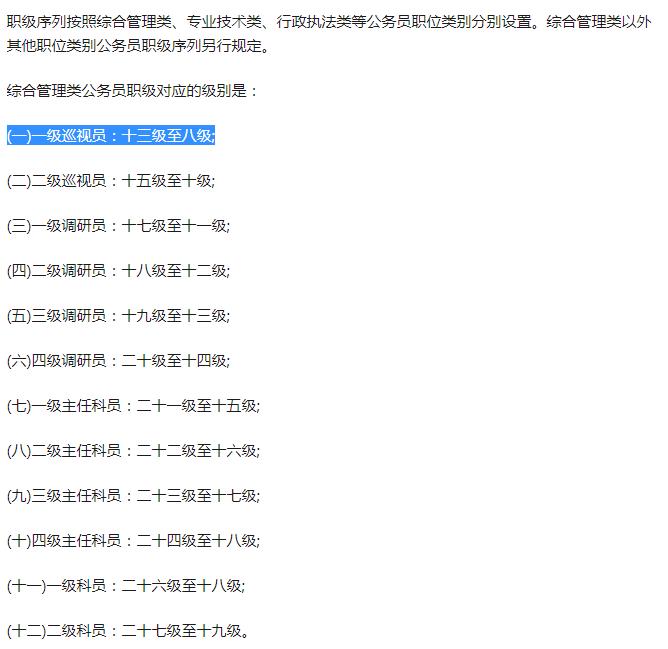 大家都知道公务员分为领导职务和非领导职务,而今天说的巡视员就是非领导职务,巡视员主要职责是巡视监督政府各个部门的工作情况,并且向上级领导汇报,让领导掌握各部门的运作现状。巡视员一般在省级或者副省级城市有设置,对应的级别是:一级巡视员:十三级至八级;二级巡视员:十五级至十级;如下图: