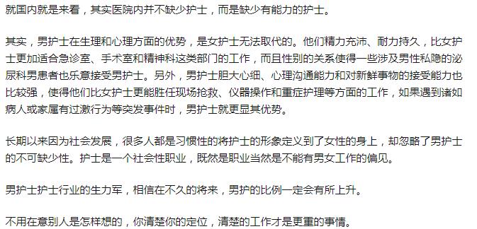 男护士找不到对象真的假的 男护士是我国新兴的一种职业。在大多数人印象里,护士就应该是女的,无论是南丁格尔塑造的经典形象还是现实医院里清一色的白衣天使。 很多人说之所以男护士少是因为当了男护士找不到对象是真的假的? 知乎上有一当了五年男护士现在已离职的男孩子说,男护士确实不好找对象。首先就是这个职业听起来比较没面子,虽然男护士比较稀缺医院里也喜欢招聘男护士,但是社会上认可度不高。第二就是护士收入不高,不能为家庭提供更好的物质条件。 当然,也有的说,男护士在女人堆里很好找对象,仁者见仁吧,找对象的难易跟你是护士没关系! 大部分男护士找的都是做着相同护理工作的女同事,看来消除社会上对男护士的偏见和提高他们的待遇,才能解决男护士少的问题。 男护士一般能干几年 虽然我们平常在医院看到的护士都是年轻护士,但其实护士并不是吃青春饭的,从20-55岁都可以做护士,只是他们服务的岗位不一样。年轻一点的可能在病房、门诊这样的比较辛苦的岗位,年纪大一点可能去手术室、icu这样的技术性高一些的岗位,毕竟积累了这么多年的护理经验。 男护士也一样,30岁以前可能做病房、门诊护理,30岁以后可能就去手术室等地方。当然如果有机会也有些人会选择去医院的后勤部门,毕竟四五十岁的男护士是很难在医院见到的。 真希望医院里可以多一些男护士,因为如果女孩子生病了去医院能遇到个帅帅的男护士,说不定能减轻不少病痛呢! |