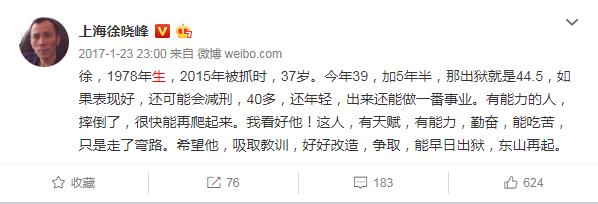 年前他就不断的看空,结果大盘不断给他打脸,一路上涨,最后武汉疫情的黑天鹅勉强让其的预测得到印证 ![]() 年后徐晓峰在开盘大跌后,喊大家抄底,在涨到2950点的时候撤退,并且说要大跌了,在其高喊2周后,股市因为国际疫情大幅下跌,特别是美国,多次熔断,徐晓峰一战成名! ![]() 大家都知道,我们国家还有一个著名的姓徐的投资人,叫徐翔,因为内幕交易被判刑了,徐翔的公司也在上海,有不少人会想问徐翔和徐晓峰是什么关系?? 其实两个人除了姓一样,工作性质差不多之外,没有任何关系,徐翔出生于宁波,是宁波人;徐晓峰是地道的上海人,不在一个地方,没任何沾亲带故。 ![]() 在2017年徐翔被抓的时候,徐晓峰还写个一个微博来表达自己的看法: 大约就是说希望徐翔好好改造,出来的时候遵纪守法,再东山再起! ![]() |
