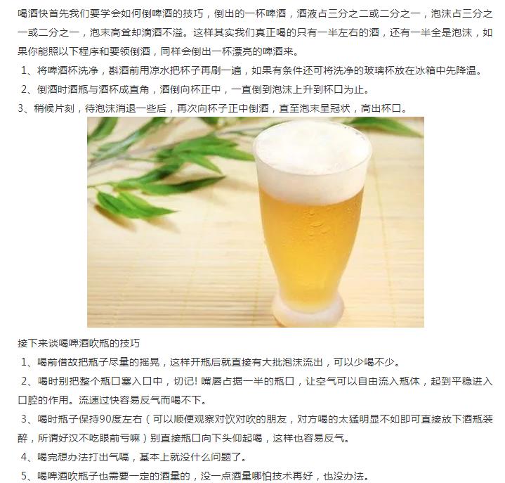 相信不少应酬多的朋友都知道,在饭桌上总是少不了用喝酒来打交道增进感情沟通的时候,而我们很多朋友其实酒量并不是很好,但是为了能够和对方关系更近一步或者能够谈成业务、买卖合同之类的,就不得不喝下这些业务酒,特别是喝啤酒的时候,有时候喝到兴头上了就会想吹啤酒,但是吹啤酒其实是很容易醉的,不过后来就有人说了,吹啤酒其实是有技巧的,小编立马也去网上了解一下,这就为大家送来一系列的技巧图解,还有一个最牛的3秒吹啤酒的技巧来了,我们这就来一起看看!