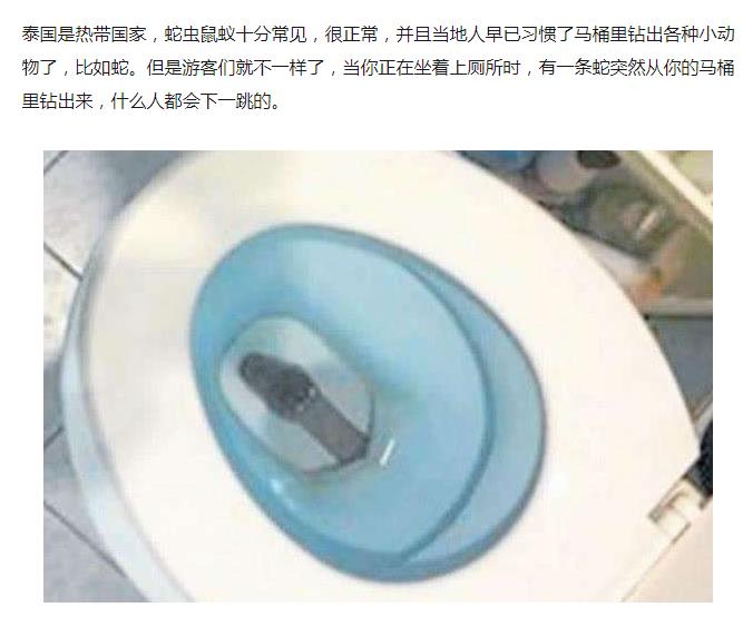 ![]() 泰国上厕所被蛇虫伤人的照片 去过泰国旅游的人一般都会注意到这样一种现象,那就是泰国酒店的马桶一般都是盖好盖子的,如果你以为这是怕有异味传上来那就错了,这是因为怕有蛇虫从下水道钻上来在房间里乱跑。 ![]() 曾经有游客上厕所的时候就被从下水道里钻出来的蛇虫咬伤,被送到医院缝了好多针。 ![]() 因为泰国地处热带,蚊虫等生物也非常喜欢炎热的环境,所以泰国的蚊虫是非常严重的。如果在泰国旅游,上厕所前一定要把马桶冲一下再上,上完厕所再盖上。 ![]() 蛇虫的样子照片来了 蛇虫并非一种动物,而是泛指蛇虫鼠蚁这样的对人类健康有危害的动物。 泰国曼谷一位男子在公司上班上厕所的时候就曾经被一条十英尺的蛇咬伤,送到医院缝了15针。这条蛇随后又钻进了马桶里,专家花费了半个多小时才把这条蛇从马桶里引出来赶到了大街上。 ![]() 不少网友看到这样的新闻表示,还是不要去泰国旅游了,这是冒着生命危险在上厕所呀。所以如果你真的去泰国旅游千万不要蹲在路边上厕所,说不定就有哪只蛇虫钻出来叮咬你的屁股。 除了蛇以外,还有不少虫子会咬人,比如下图这种毒隐翅虫,被它咬后就会出现关节肿丶疼痛腹泻等多种状况,不过并不会危及生命。 ![]() 还有一点需要注意的就是,遇见蚊虫叮咬千万不要把它拍死在自己身上,尽量用东西把它弹掉。 ![]() |