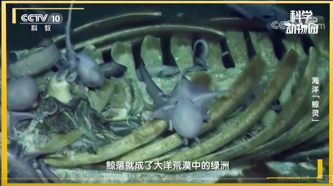 鲸落,也就是鲸死亡后落入海底形成的一个小小的生态圈,鲸鱼死亡落入海底后,他身上的软组织会被大型的海底生物吃掉,慢慢的最后只剩骨骼,别小看骨骼,这可是海底生命的绿洲,这些骨骼会被海底的微生物分解,分解产生的化学物质会供非常多海底生物来维持生命,而这一过程可以长达几十年甚至上百年,成了海底生物最重要的一个生态链之一。