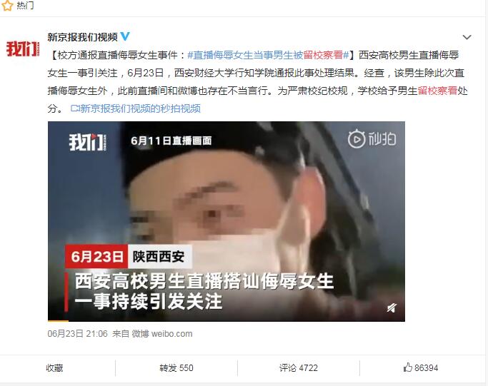 近日,西安财经大学行知学院一学生因为在直播时为吸引眼球,公开发布侮辱女性的不当言论,造成极不好的社会影响,被学校罚已留校察看的处分。