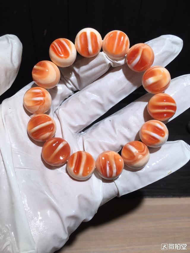 万宝螺是世界四大名螺之一,属大型贝类,分布于印度洋及太平洋热带区域内的珊瑚礁周围,世界上万宝螺数量稀少,而且难捕捉,是一种很珍稀名贵的螺类。万宝螺形成的手串温润细腻的表面有一道道呈放射性纹理,自然纯朴。万宝螺可以盘成佛珠,但是盘成佛珠后,万宝螺光鲜亮丽的色泽不能像其他手串一样一直保持,万宝螺盘成的佛珠是会越盘颜色越黯淡的。