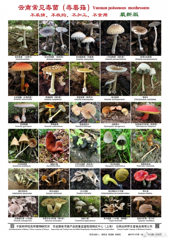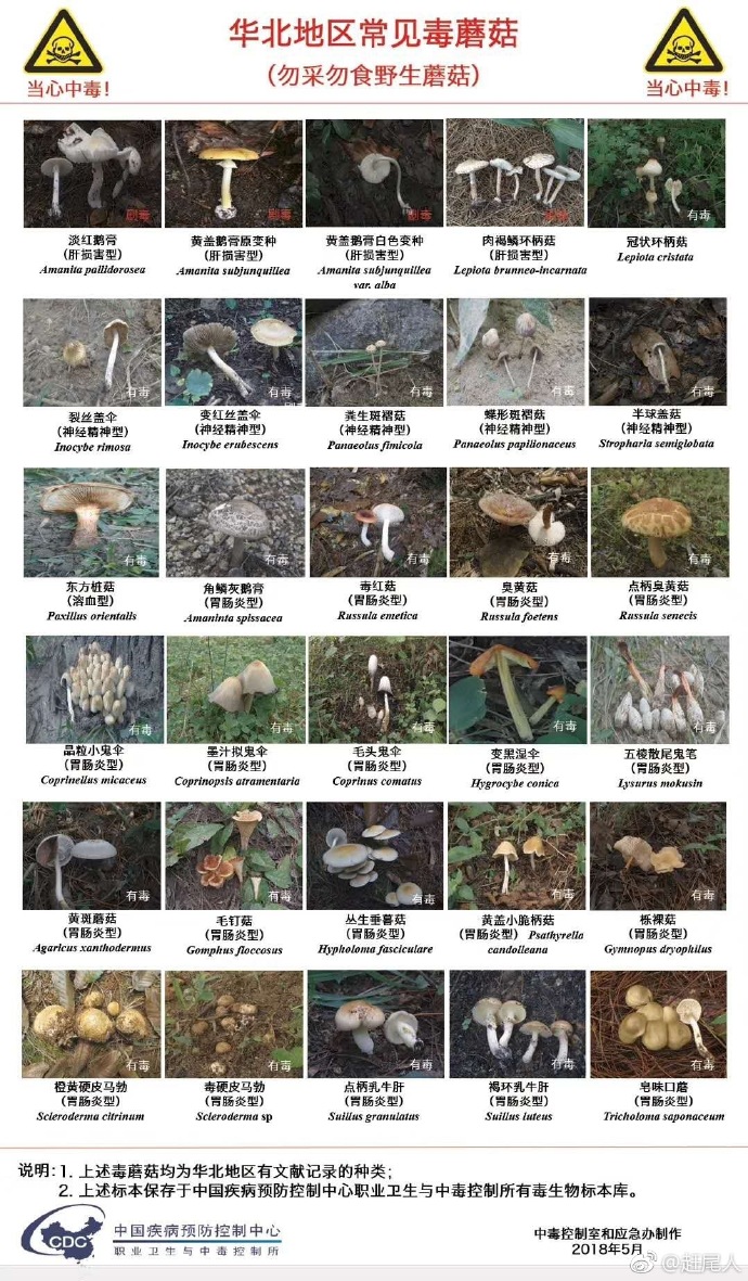 我国最具代表性的毒蘑菇是大青褶伞,含鹅膏毒肽的剧毒环柄菇类等等,下图为微博科普博主@赶尾人 整理提供的我国常见毒蘑菇图片。