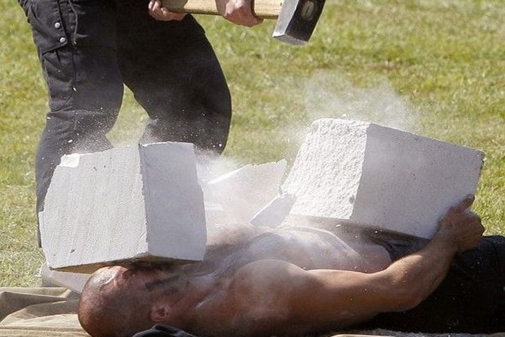 小编小时候生活在农村,偶尔会有杂技团去村子里表演,一般双脚踩灯泡胸口碎大石这样的经典曲目是必不可少的。大石头压在身上然后拿大锤子敲碎,石头下面的人却毫发无损,这是什么原理呢?