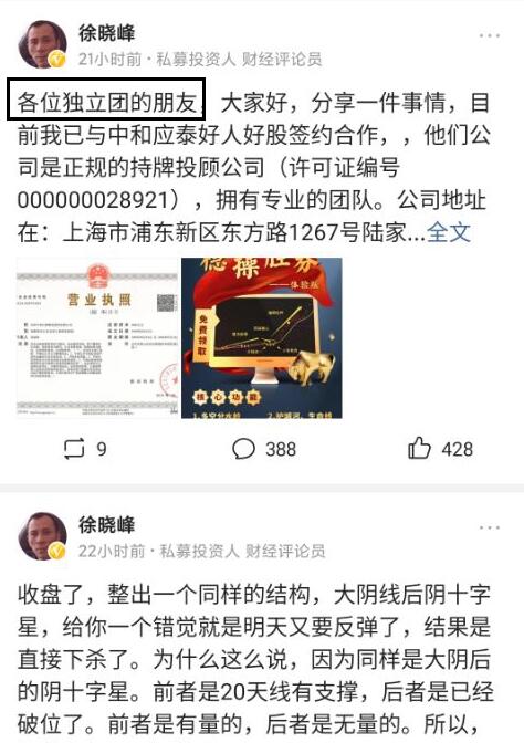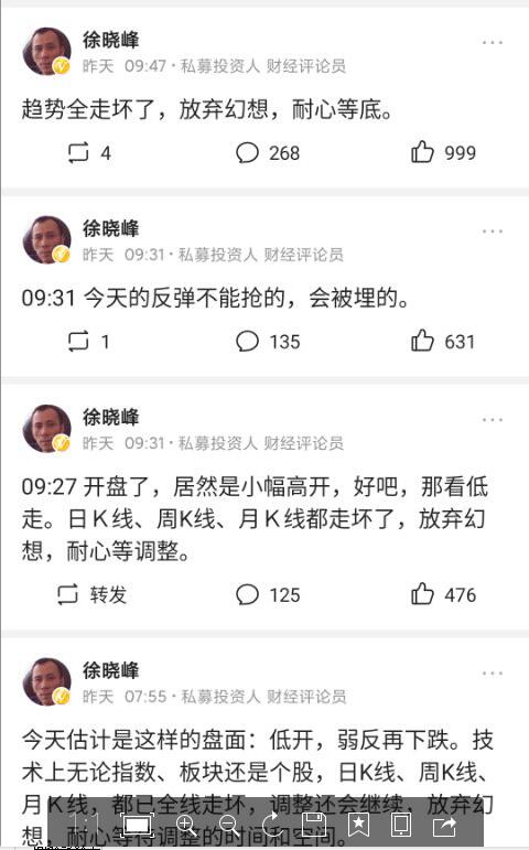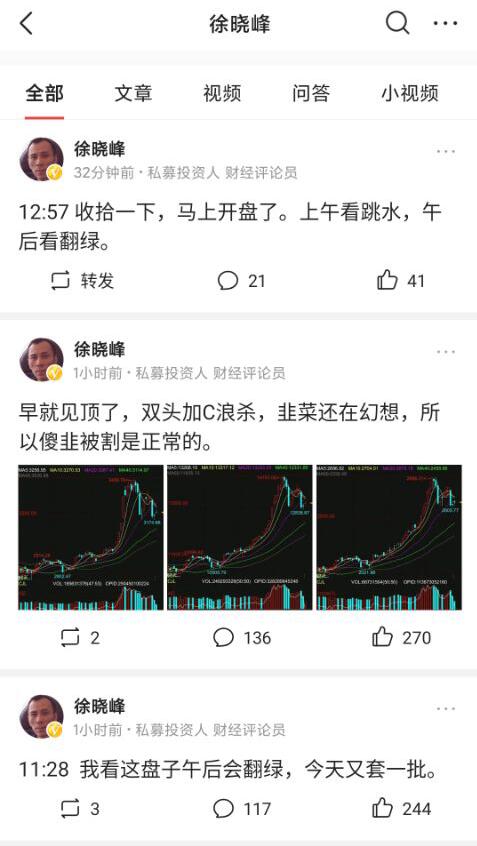 目前在民间有不少有影响力的自媒体股评员,其中以wu2198、徐小明、叶荣添、天津股侠、徐晓峰等人影响力最大,他们的要么在微博上拥有大量粉丝,要么在微信、头条上有很多粉丝,跟随他们的有一大批人,文章阅读量都动不动就是10万+的级别,而他们这些股评大V当中又以徐晓峰性格最为鲜明,股评的时候经常会带上个人的情绪,有人爱他,有人恨他,也有人鄙视他。