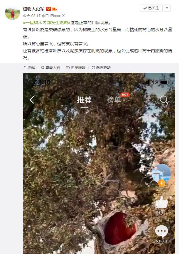 树木内部树心自燃是什么原因造成的?为什么没有烟?不能扑灭?