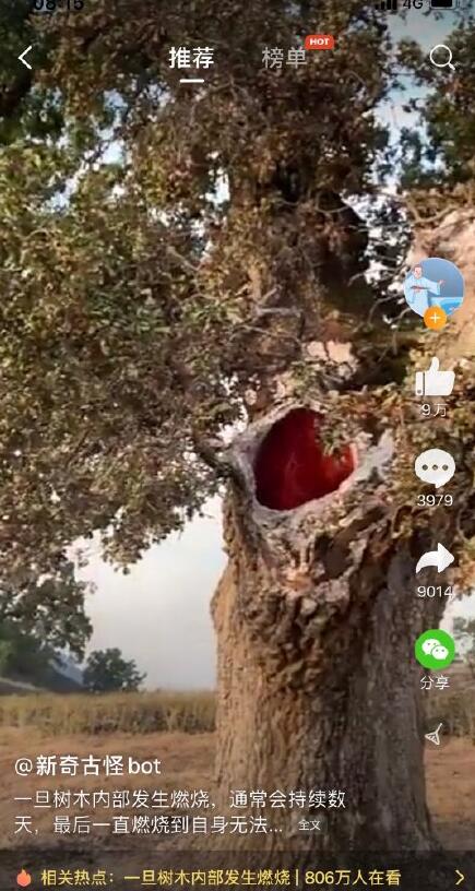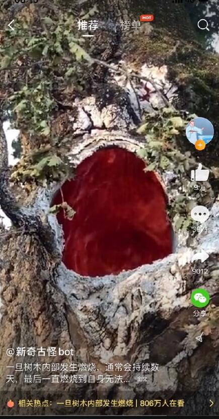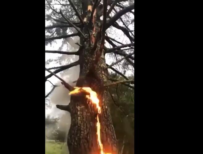 下图是某抖音博主发的一段视频,树心正在燃烧,火势很大,奇怪的是一点烟都没有,这种情况大多是因为此树是被雷击中燃烧所致,雷火导致的高温会迅速碳化一大部分树干,所以燃烧不会冒浓烟。
