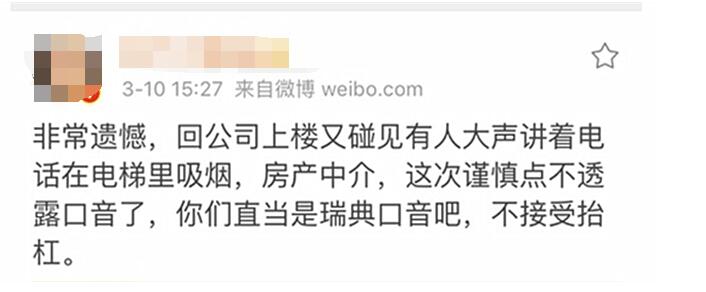 2个月后,他又发微博称在电梯里又遇到一个大声讲电话,还在电梯里吸烟的人,为了避免再有人拿地区抬扛,他只好用瑞典口音代替,从此以后,瑞典成了东北的代用词汇。