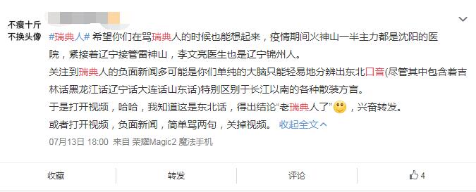 但随着这系列词汇的演变传播,“瑞典”成为了地域黑东北的新名词,只要与东北相关的负面新闻,总会有不少网友在评论里说“瑞典人”如何,听上去阴阳怪气,十分的刺耳。当然东北地区的人也十分反感这一词。