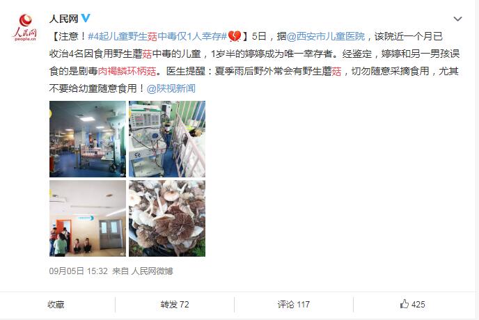 陕西西安4名儿童因食用肉褐鳞环柄菇中毒,经抢救仅1人幸存。