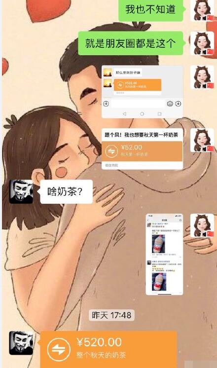 事情起源于,一个男生给女朋友发了个52元的红包,说这是秋天的第一杯奶茶,女孩截图把事情发了出来,引得无数女生羡慕,纷纷效仿。