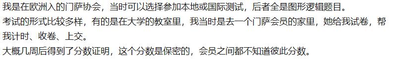 门萨会员怎么考, 要想进入门萨会员参加考试,首先要找到当地的门萨俱乐部,询问监考,考试事项,有网友表示自己是在一个门萨会员的家里参加的考试,可见他们这个俱乐部是要有监考人员认可,考试试卷依据,基本上就可以加入了的。 考试的内容据说是,在中国大陆的门萨试题是图形推理测试,有一共45道图形选择题,需要参加人员在20分钟内完成,其他地区也是有自己不同的考试规定,看上去是都很严苛和高难度的,这个相信对自己的智商不是一定的自信的人是有点望而生畏的。 考试的内容和试卷都是门萨会员内部人员规定的,这个试卷据说是有超高难度,需要智商超过148才能看懂做得出来,这样进去之后,才能跟其他成员有一个无障碍的沟通交流。 成为门萨会员有什么好处? 成为门萨会员的好处还是很多的,不然也不会有那么多人想着想要加入进去,首先应该就是证明自己的智力水平了,有时候我们觉得自己是高智商人群,但是没有一个佐证,而门萨会员就是一个全世界公认的证据,对于自己的智商是一个数据可显的肯定。 然后就是能认识一群高智商人群了,和他们在一起能讨论到很多深刻的话题,增长自己的见识和知识面,扩大自己的交际面。 |