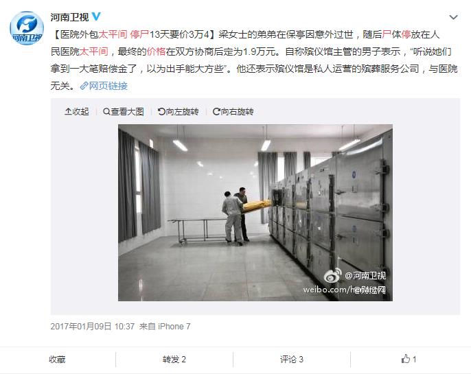 ![]() 停放尸体需要冰棺,或者需要太平间内有比较低的温度,防止尸体腐烂,这些对应的措施都是有成本的,所以太平间不是想放多久就放多久,是要花钱的,这也无可厚非。根据很多新闻线索来看,目前不少医院的停尸间是外包的,挺尸一天的费用不便宜,从几百到上千都有,比如下面这条新闻里面,停尸13天最终谈妥了要给1.9万,相当于每天1400多元的费用。 ![]() 再比如下面这则新闻,也是太平间被承包了,停尸67天收了4万元,折合每天597元。 ![]() 另外,关于太平间的安排大部分是在负一楼,当然并不是都在负一楼,安排在负一楼等的楼层主要是有以下几点考虑: 1、负楼层人迹罕至,避免太平间对胆小的活人造成惊吓。 2、负楼层在夏天的气温也相对较低,可以大大节省运营成本。 ![]() |