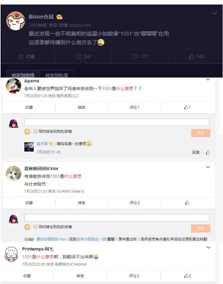 15551,谐音噫呜呜呜噫,类似一种哭泣的声音,与嘤嘤嘤有异曲同工之妙,小女孩们喜欢发15551是表达自己在哭泣需要人哄,或是有点小激动,还有那么一点卖萌的意味。