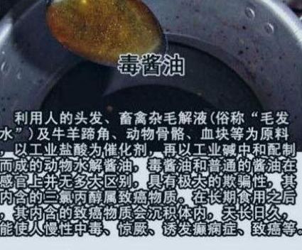 还有些不法商家会收购碎头发、动物毛发、皮革下脚料等,用药水把它们分解,得到氨基酸液,再添加各种添加剂来勾兑酱油。