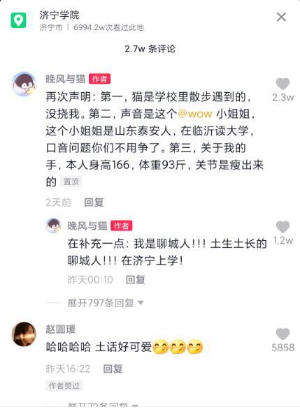![]() 小编仔细分析了一下,这个视频之所以能火,主要是这个女生说话的方言太魔性了,目前这段魔性的方言已经在抖音形成“人传人”的现象,不少家里有猫咪的视频博主都开始用这段配音录制自己家猫咪的视频,根据原视频来看这个小姑娘说的方言是山东泰安的方言,目前在临沂读大学。 ![]() |