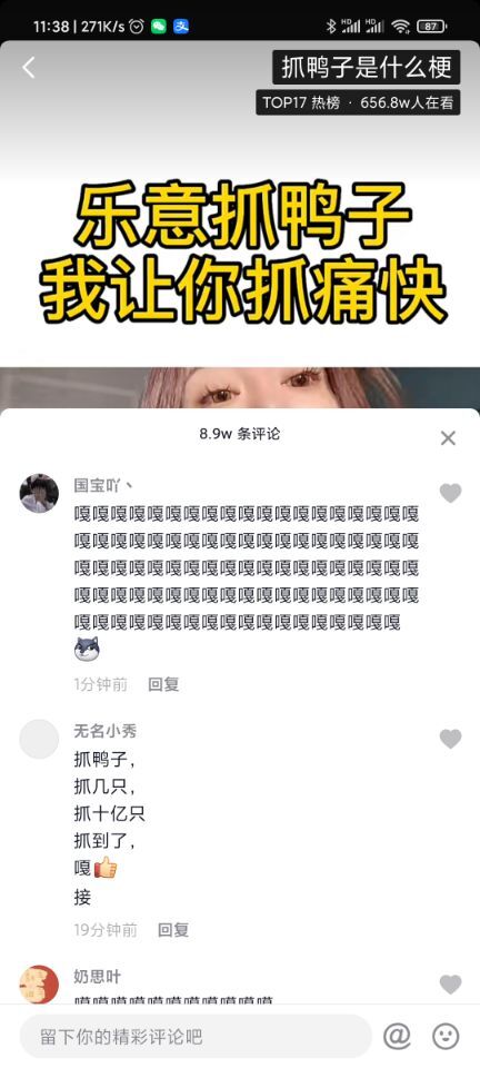 要说最近抖音上最火的一个梗当属“抓鸭子”了,特别是评论区里面好多人都在玩抓鸭子的游戏,首先抓鸭子是一个群体游戏,至少要2个人才可以玩,游戏的的台词有:抓鸭子、抓几只、抓X只、没抓着/抓着了,一旦说了抓了具体的只数之后,所有参加游戏的人就开始轮流说“嘎”,如果你说了抓5只,就要嘎5次,如果说抓了10万只,你们一起就要嘎10万次,目前抖音上玩这个梗主要就是玩抓了“成千上万只”,所以懂的人都在评论区里接“嘎”,比如抓了1万只你就要嘎1万次。 |