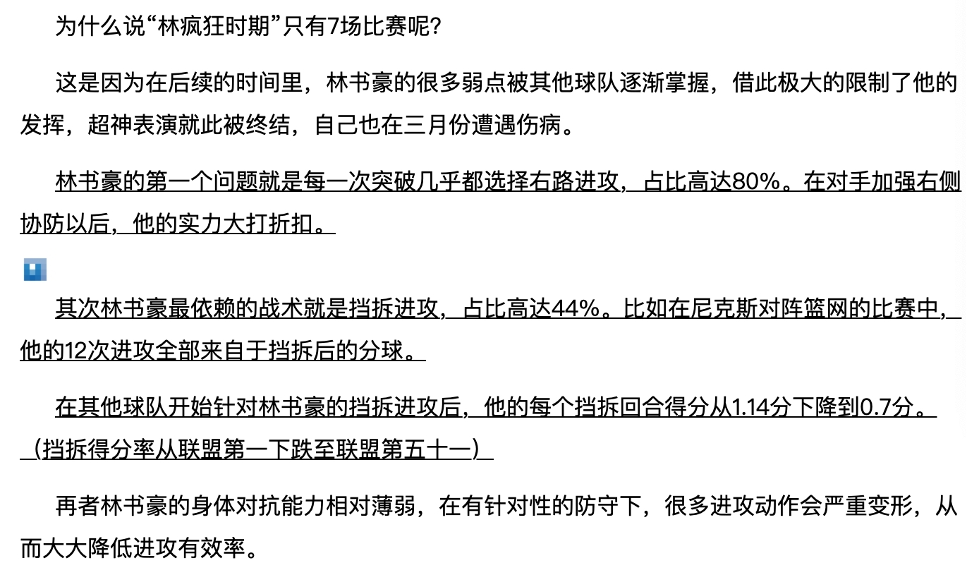 不过现在的林书豪早已经没有了当初的人气,让很多球迷都觉得非常惋惜,在人们的印象中,林书豪效力过很多NBA球队,比如说金州勇士、尼克斯、火箭队、湖人队、大黄蜂、篮网等,但要说起林书豪最巅峰的时期,绝对是在尼克斯,也就是人们常说的林疯狂时期。 林疯狂七场数据 林疯狂时期开始于2012年赛季,当时的尼克斯球员伤病不断,球队成绩非常差劲,因此才会有了林书豪的出场,在七场比赛中,林书豪就像是上帝附身,带领球队获得七连胜,因为成绩太过耀眼,因此林书豪获封林疯狂,前七场比赛林书豪场均24.4分,9.1分助攻,首发前四场的比赛一共砍下109分,排在他后面的是艾弗森、奥尼尔和乔丹,创造了NBA新的历史记录。 林疯狂七场数据分析 但是七场比赛之后,林疯狂就“熄火了”,其原因是多方面的,首先就是通过前几场比赛,林书豪的技术特点已经被对手研究透了,所以林书豪没有了奇兵优势,还会被重点防守,因此很难摸到球,还有就是林书豪遭遇了伤病,因此水平大幅度下滑,最重要的是林书豪优缺点十分明显,不具备顶级球星的实力。因此后来林书豪才会泯然众人,让球迷们失望不已。 ![]() |