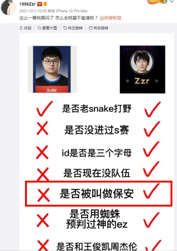 ![]() zzr有一个外号叫保安,之所以叫这个名字是因为“一开始就是替补多了,被叫保安,后来玩多了就变成梗了”,也可以认为是“zzr表达自己卑微无能的一种谦虚说法”. ![]() |