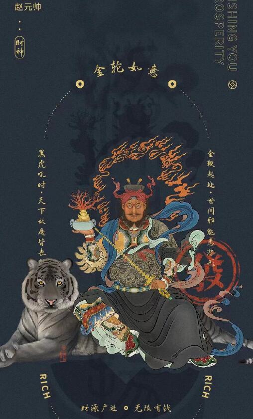 赵公明财神的形象可以根据不同的民间信仰和文化背景而有所不同,但一般来说,他被描绘为身披铠甲,外罩锦袍,形象威猛的神明。他通常手持铁鞭和元宝,左手持元宝象征财富的共享,右手持铁鞭寓意不义之财必遭天罚。赵公明常常被描绘骑在黑虎身上,黑虎象征着力量和威严。有时还会有其他的随从神明,如招宝天尊、纳珍天尊、招财使者等,一同供奉。
