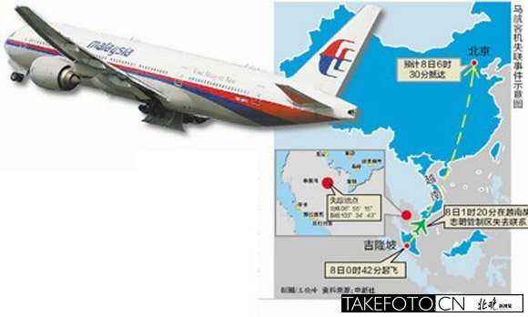 当地时间2014年3月8日,马来西亚航空公司一架载有239人的航班,在离开马来西亚首都吉隆坡后与空中管制中心失去联系,据悉这架飞机的目的地是北京,机上载有154名中国乘客。