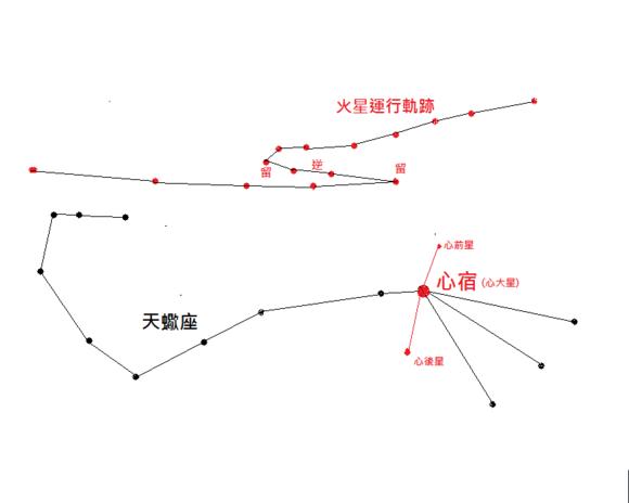 心宿有三颗星,分别代表了皇帝和皇子,皇室中最重要的成员。而不祥的火星在心宿徘徊不去,则两星相互辉映,争“红”斗艳。这就叫“荧惑守心”了。在中国的星占学上被认为是最不祥的,象征皇帝驾崩,丞相下台,兵戈将起,黎民遭殃。