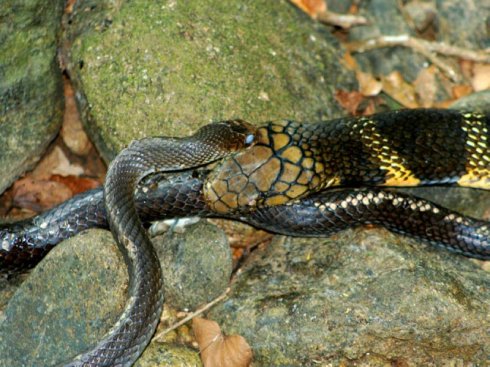 眼镜王蛇(Ophiophagus hannah)又称山万蛇、过山峰、大扁颈蛇、大眼镜蛇、大扁头风、扁颈蛇、大膨颈、吹风蛇、过山标等。虽称为“眼镜王蛇”,但此物种与真正的眼镜蛇不同,它并不是眼镜蛇属的一员,而是属于独立的眼镜王蛇属。相比其他眼镜蛇性情更凶猛,反应也极其敏捷,头颈转动灵活,排毒量大,是世界上最危险的蛇类之一。