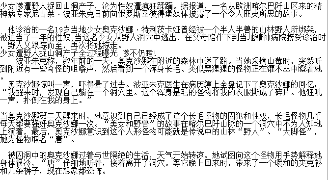 在我们这个世界里有许许多多还未被人类探知的事情!特别是在一些无人居住的山林里更是生活着无数未知的生物,从很久以前便有野人的传闻,各国也相继发现了一些野人的踪迹!少女遭野人捉山洞产子,现在世界上真的还有野人吗?下面就跟着小编一起来了解一下吧! ![]() 少女遭野人捉山洞产子 据说是在欧洲的某个地方一女子在山林里游玩被野人抓回山洞中囚禁了数年,每日野人都会在女子身上泄欲,导致女子怀孕,并在山洞中产子! ![]() ![]() ![]() 现在世界上真的还有野人吗? 野人是世界上四大谜团之一,很多的科学家表面野人是存在的,但是至今无人能够清楚的拍摄到野人的照片!在世界各地许多的探险爱好者都表示看到过野人的身影! ![]() ![]() |